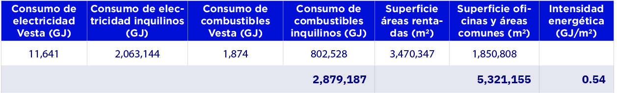 El consumo indirecto de nuestros inquilinos fue de 2,063,144 GJ de energía eléctrica y 802,528 GJ de combustibles.